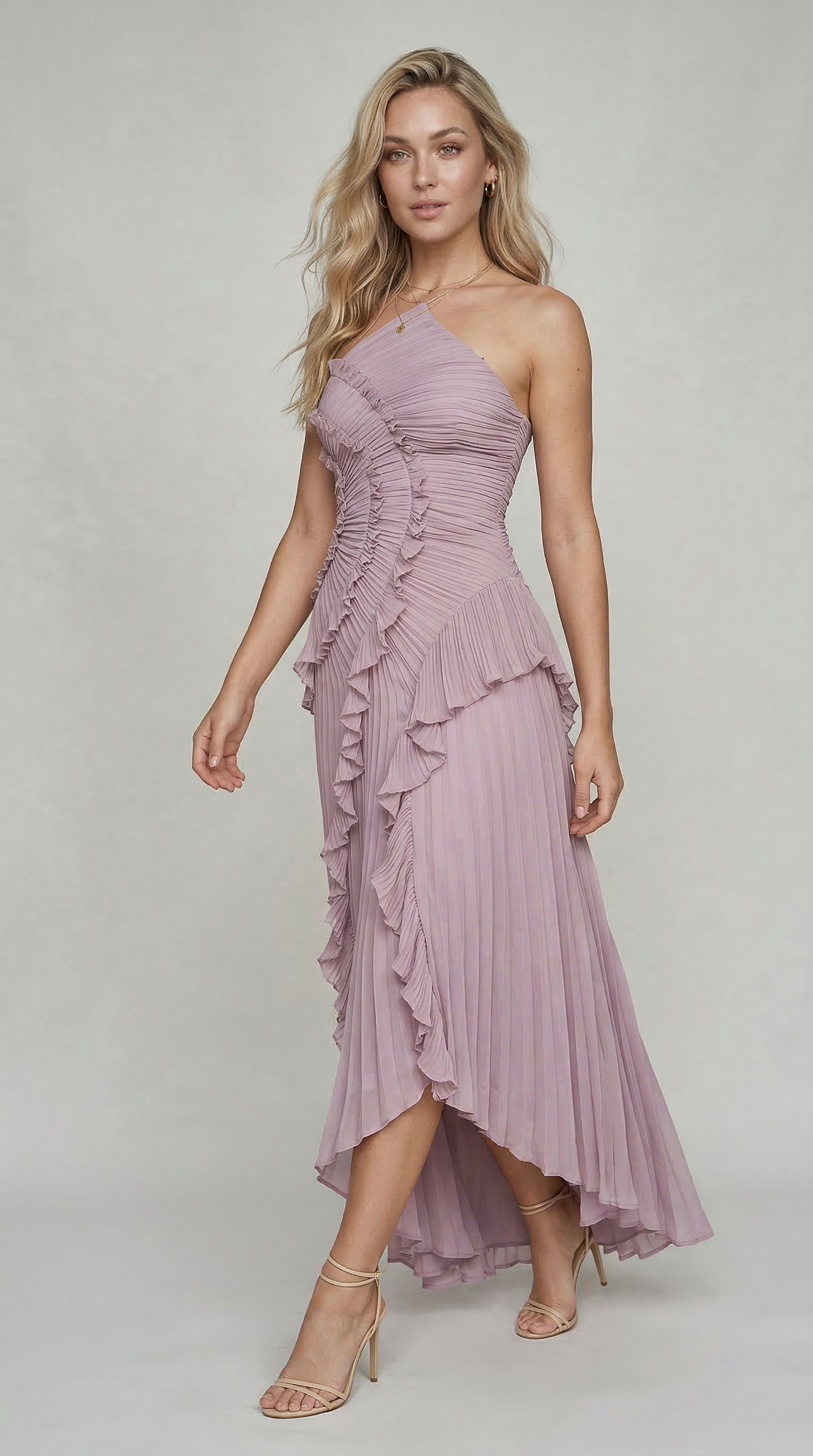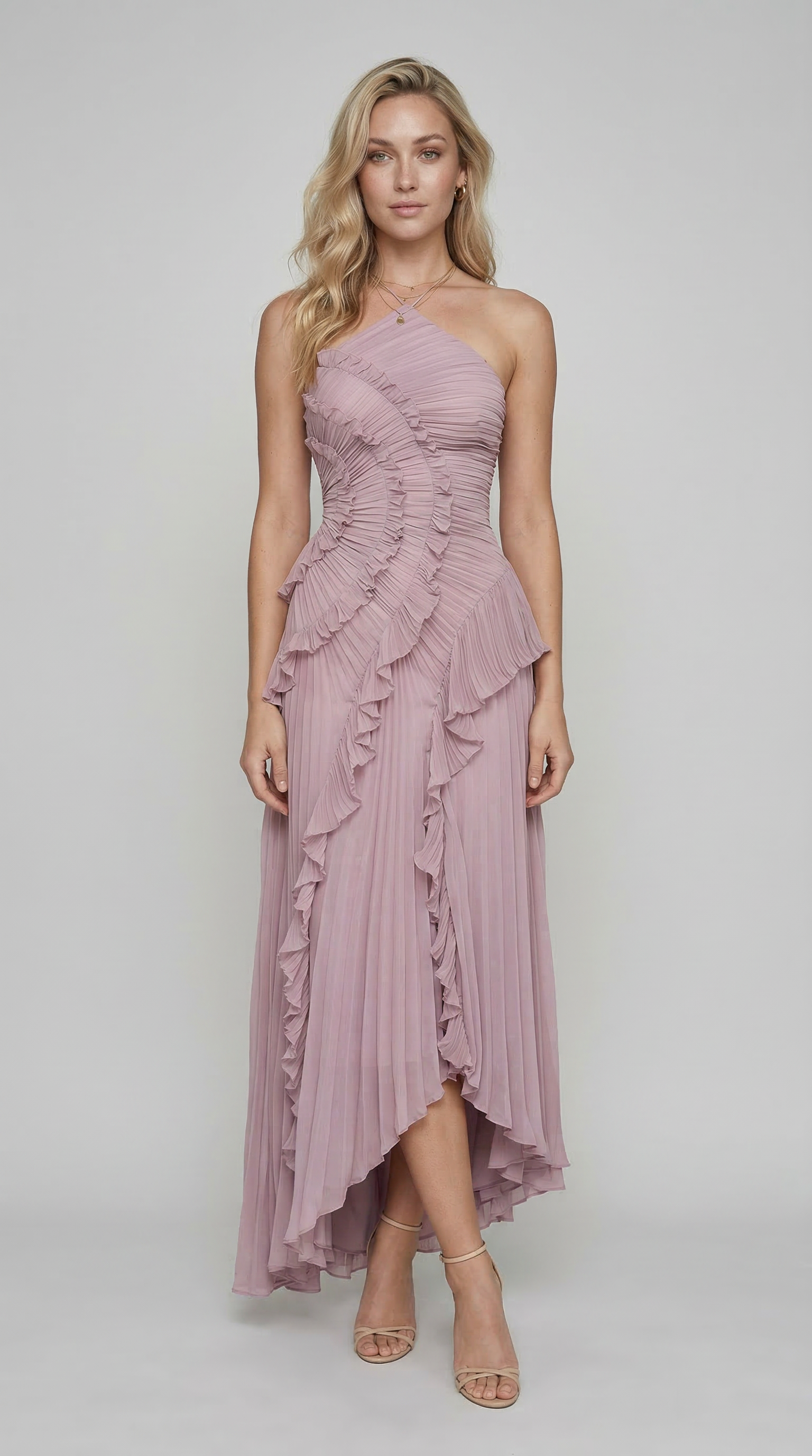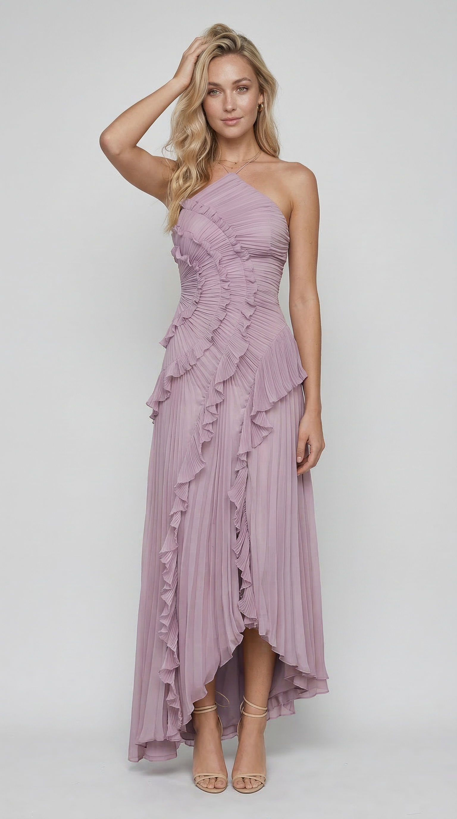 Vestito lungo asimmetrico in tonalità lavanda con scollo halter e raffinato design plissettato. Il corpetto presenta un elegante drappeggio con volant a cascata che seguono la silhouette, creando movimento e leggerezza ad ogni passo.