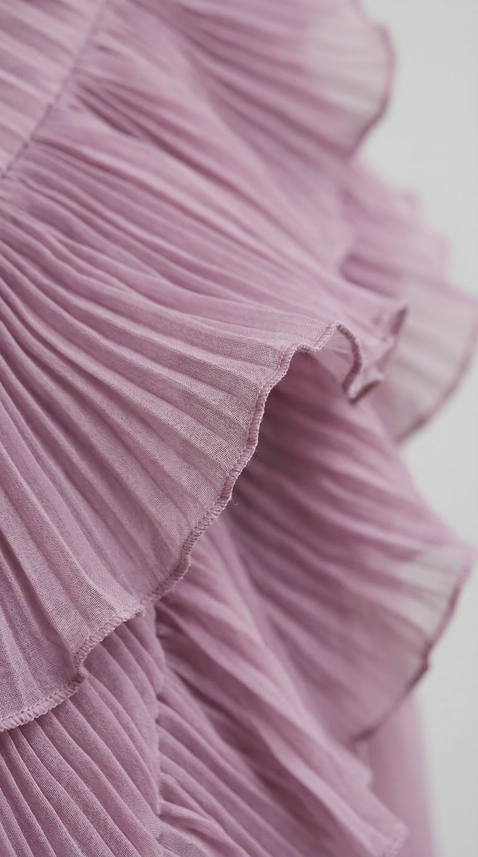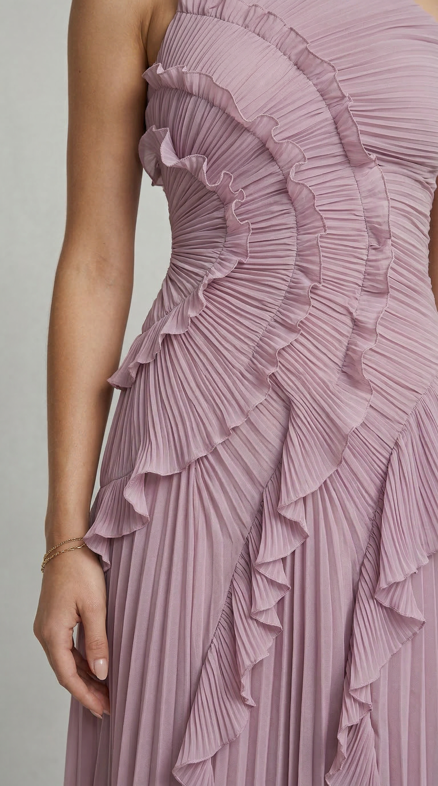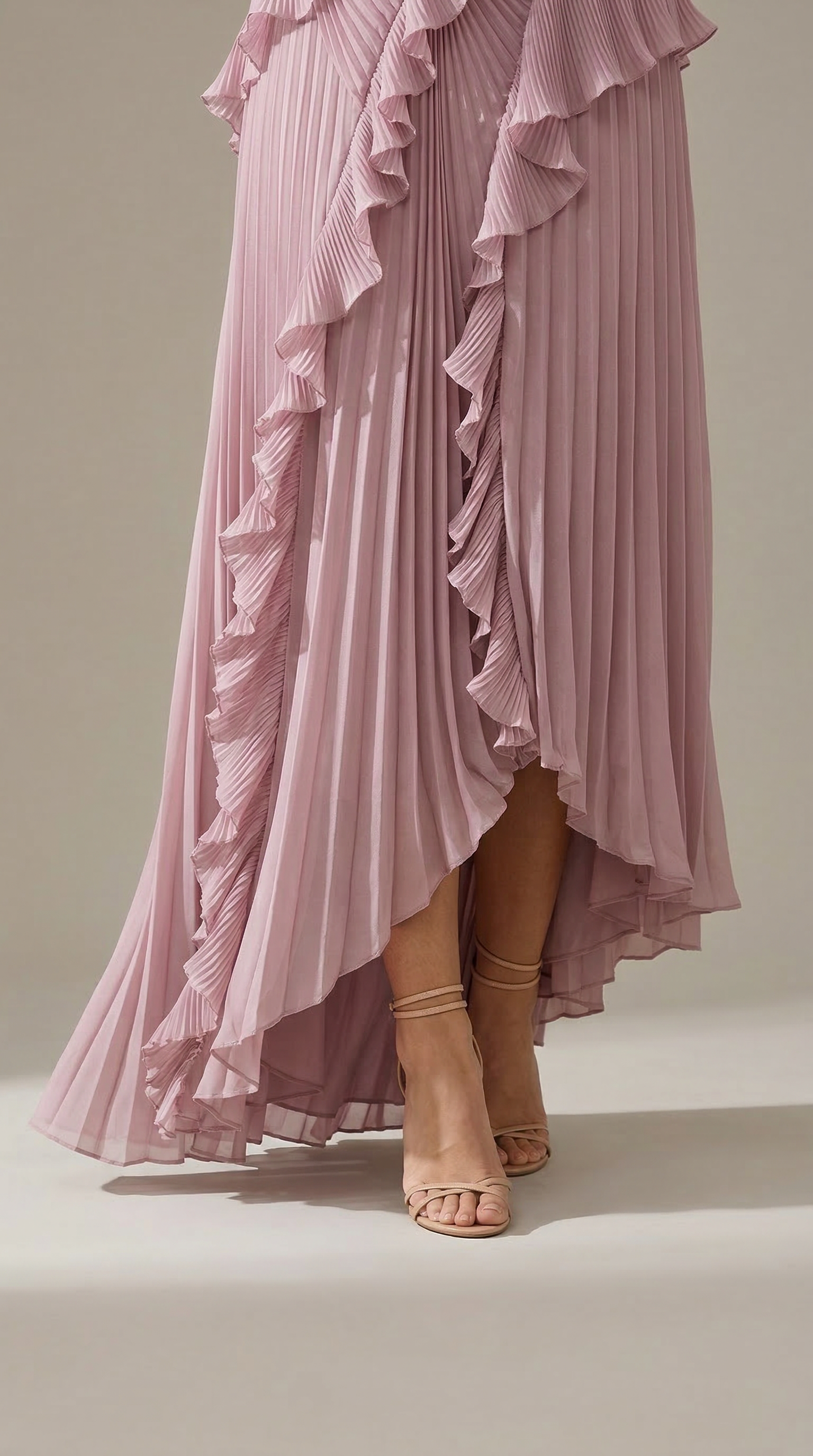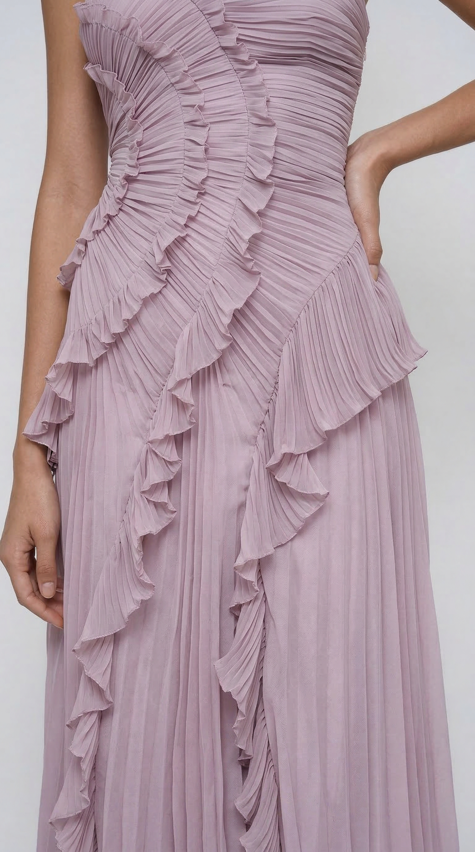 Vestito lungo asimmetrico in tonalità lavanda con scollo halter e raffinato design plissettato. Il corpetto presenta un elegante drappeggio con volant a cascata che seguono la silhouette, creando movimento e leggerezza ad ogni passo.