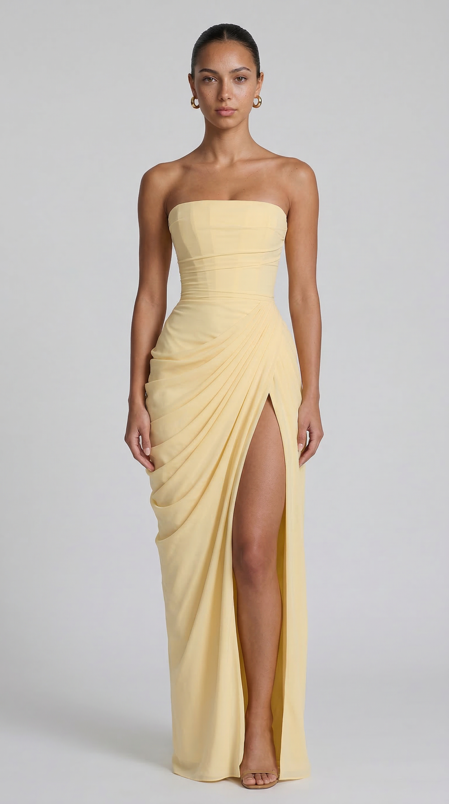 Il Cyra Maxi Dress in chiffon si distingue per il suo design raffinato e la silhouette elegante. Il corpetto senza spalline con plissettatura direzionale valorizza la figura, mentre il corsetto interno con allacciatura sul retro crea una vestibilità perfettamente aderente. Il drappeggio asimmetrico scivola delicatamente sui fianchi fino a una gonna a colonna, completata da uno spacco alto che dona movimento e sensualità al look.
